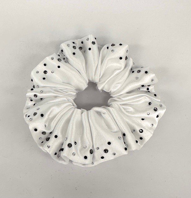 "BLING" Single Colour Dupion Polyester Satin Scrunchie - Bright White (33) with 3mm Black Diamond, 2mm Jet Black & 2mm Clear Crystals