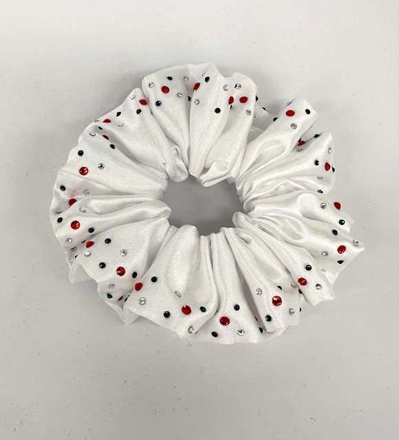 "BLING" (33) Bright White Scrunchie with Red, Emerald Green & Clear Crystals
